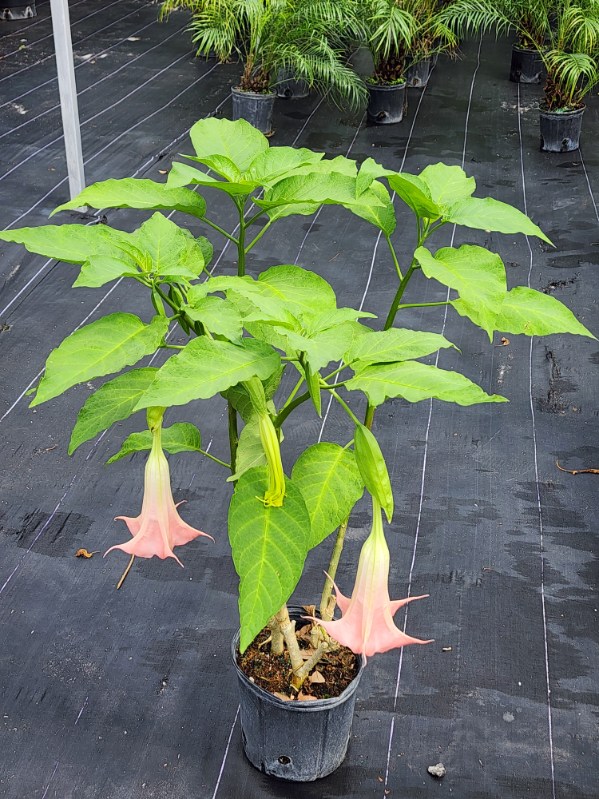Angel Trumpet plants produce large, hanging flowers in shades of white, yellow, peach, pink, and orange. Blooms typically appear from late spring through fall.